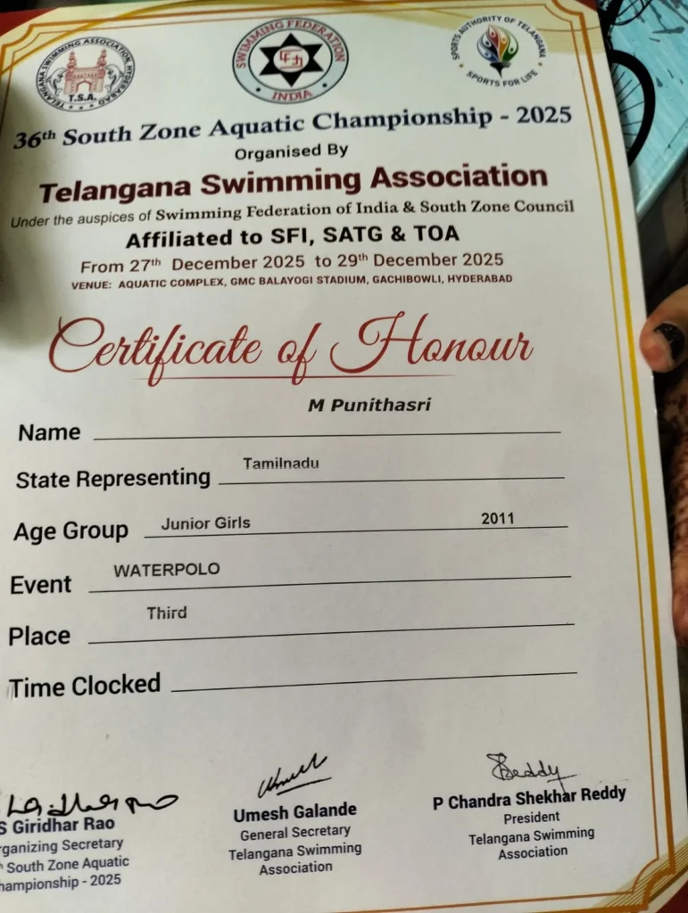 M. Punithasri, a student of St. Ignatius Convent Higher Secondary School, Palayamkottai, won Third Place (Bronze Medal) in Junior Girls Water Polo, representing Tamil Nadu at the 36th South Zone Aquatic Championship 2025, held in Hyderabad.
